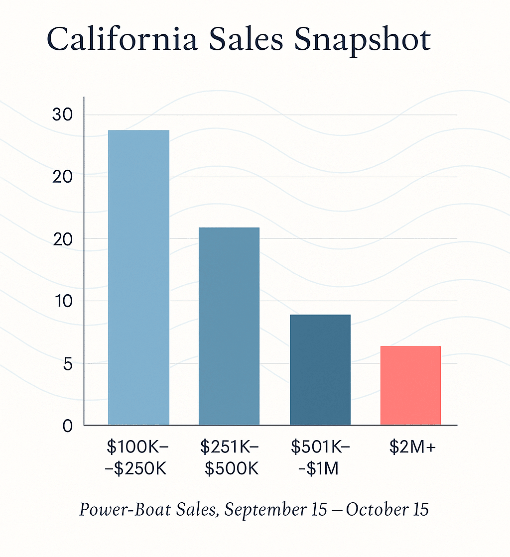 Reported power-boat sales across California show a typical late-season moderation following a strong summer. Compared with the previous period (August 15 – September 15):