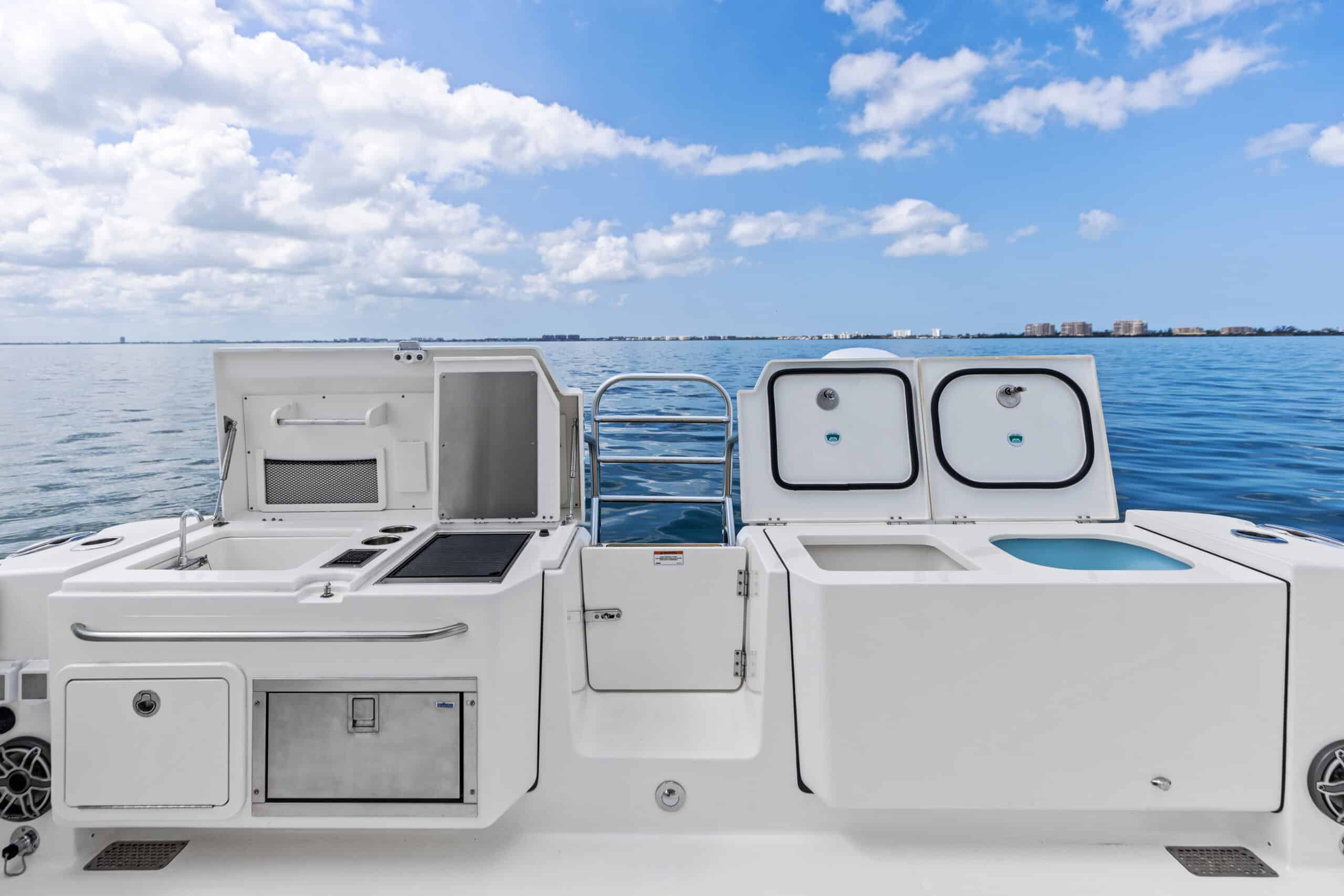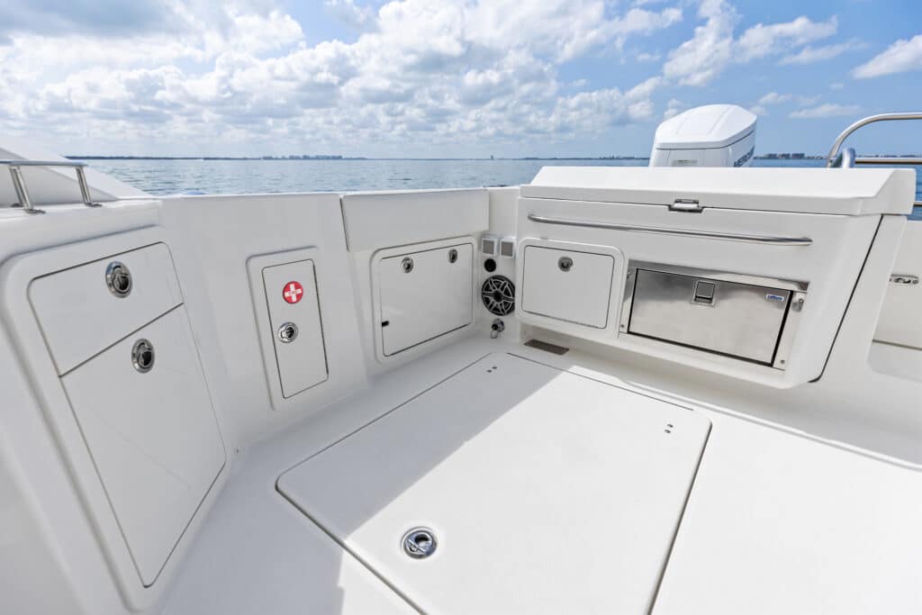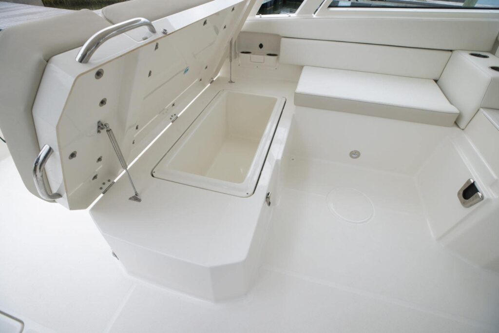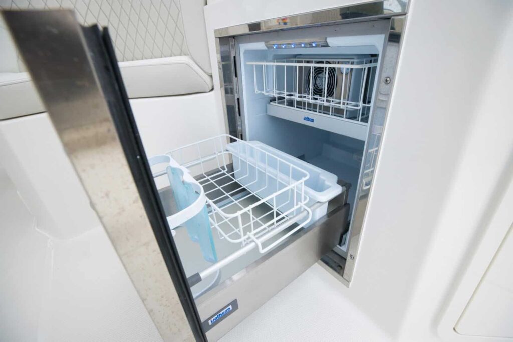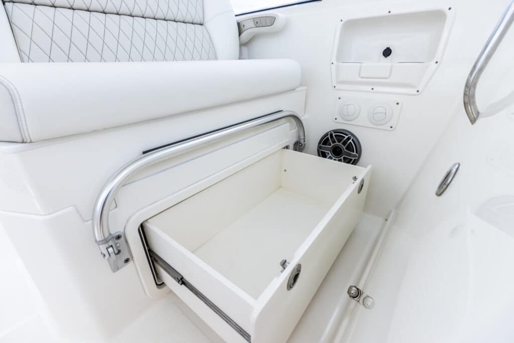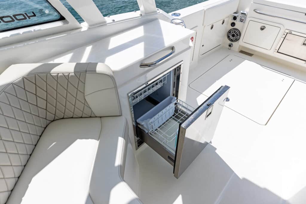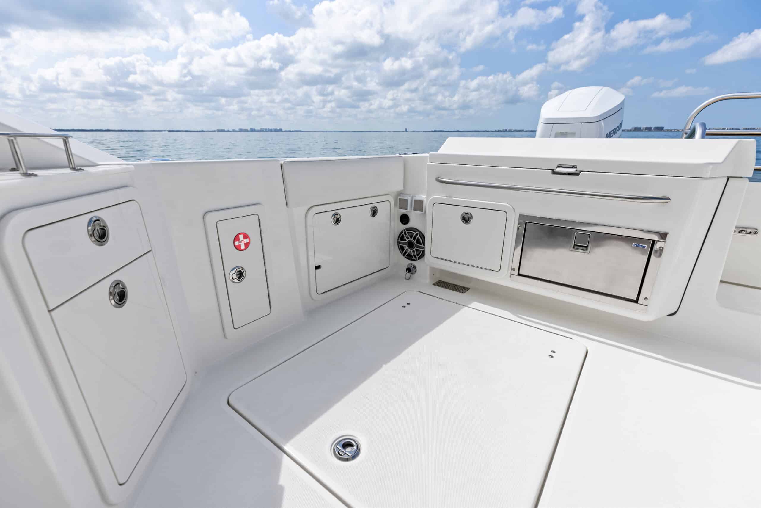 - Entertainment Center: Refrigerator Drawer, Aft Facing Seat w/ Storage Under, Storage Drawer, Helm Air Conditioning Vents & Tilt-Out Trash Can