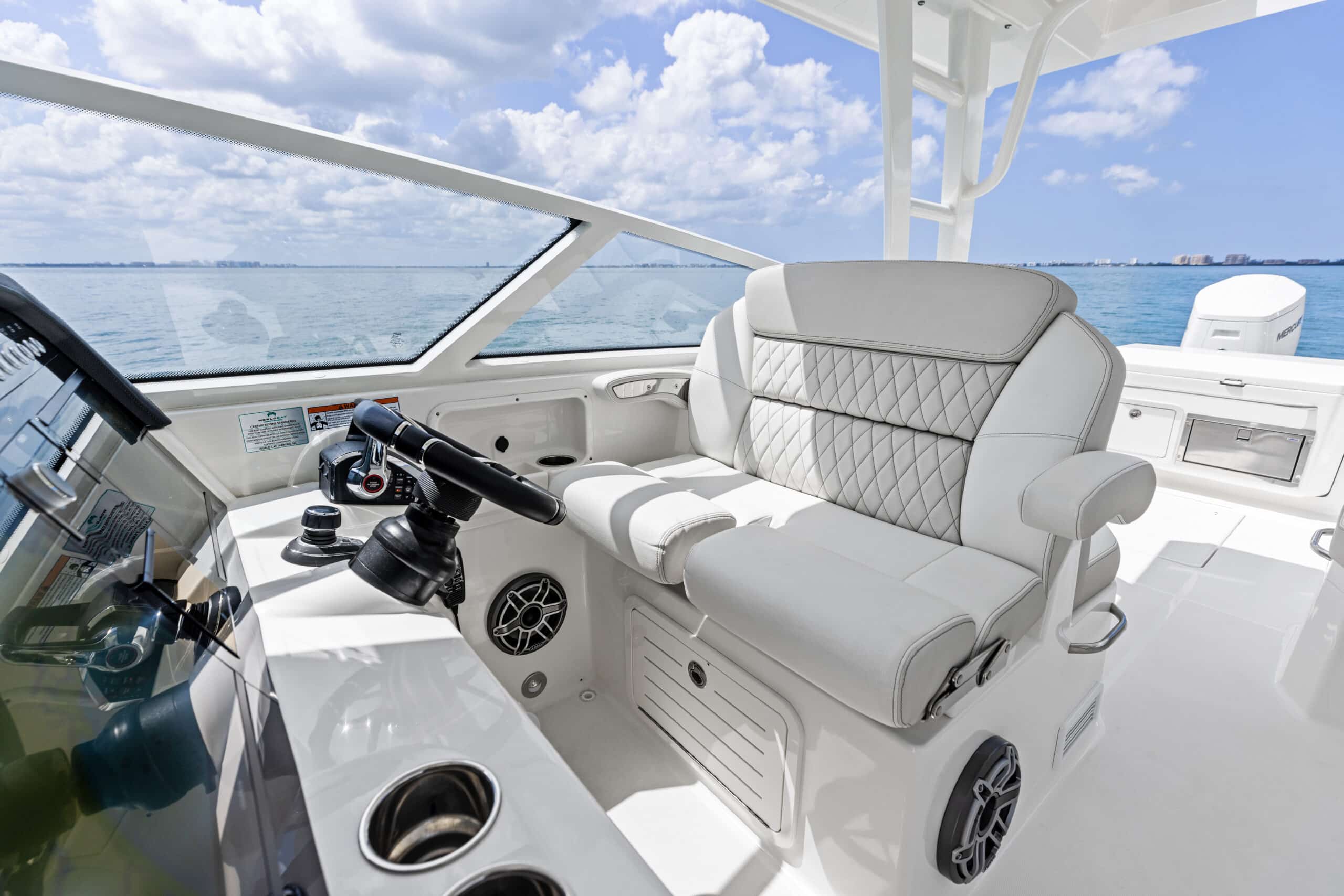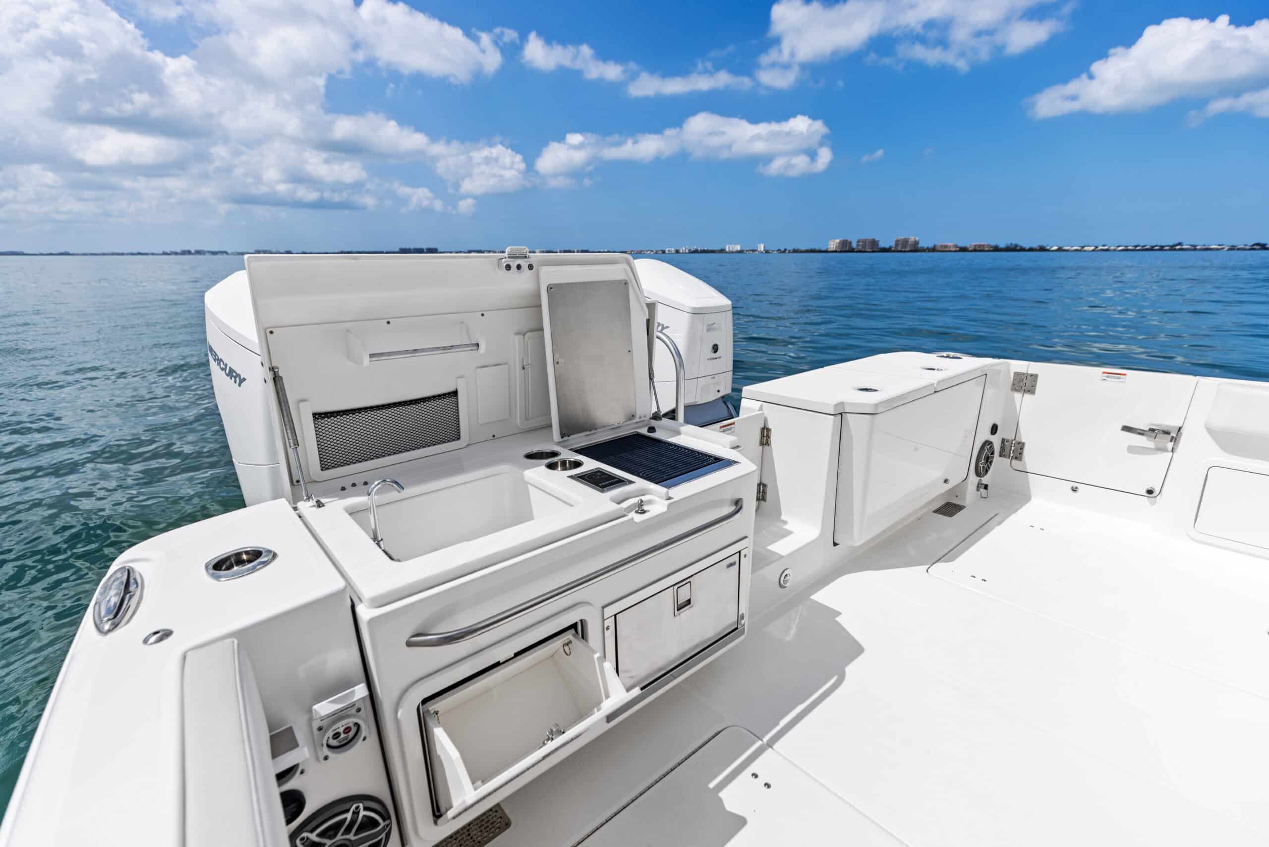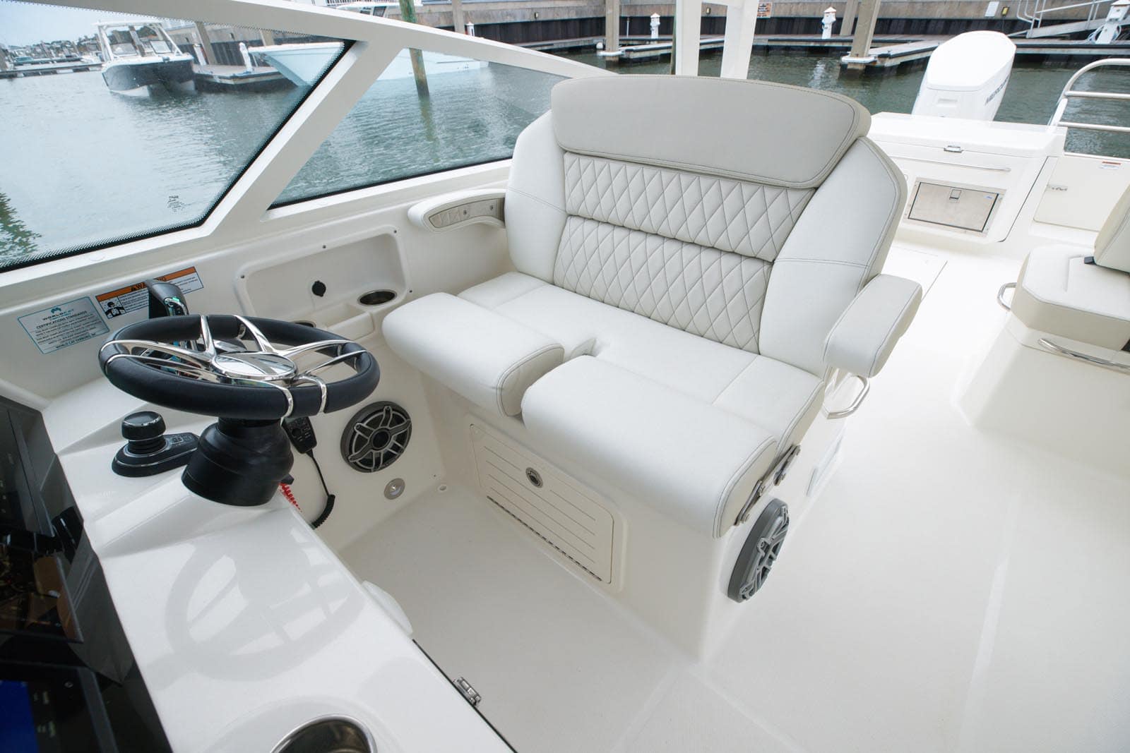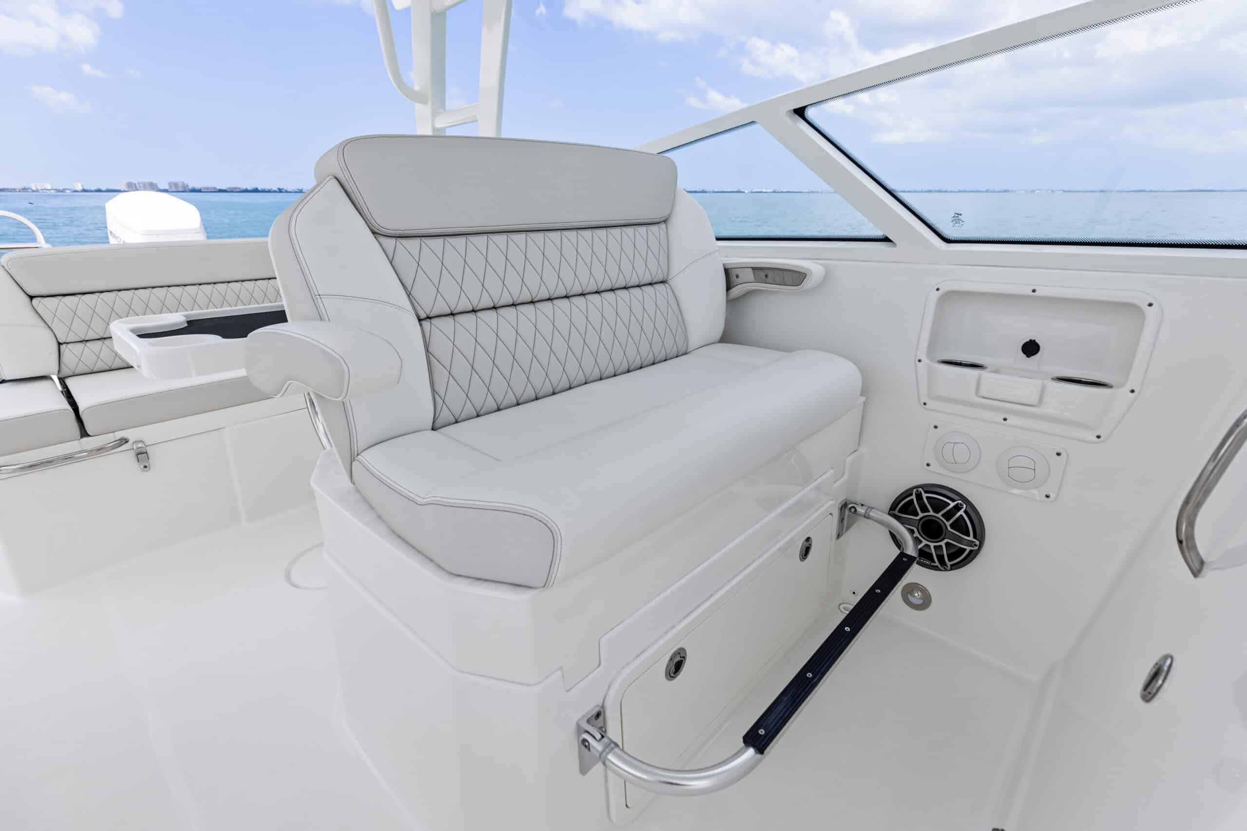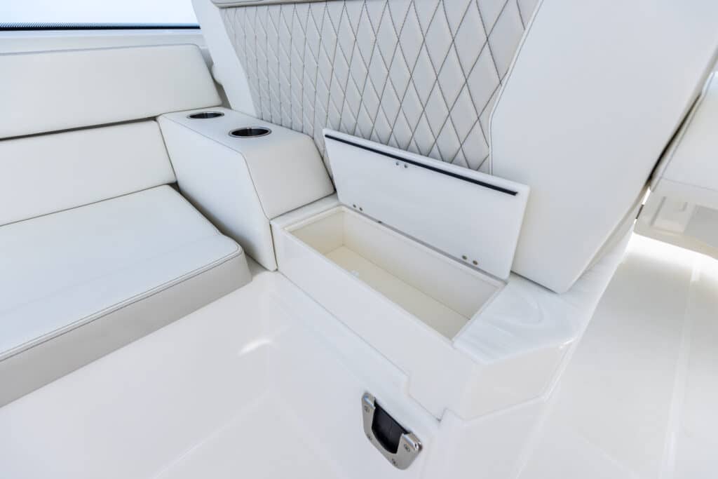 - Entertainment Center: Refrigerator Drawer, Aft Facing Seat w/ Storage Under, Storage Drawer, Helm Air Conditioning Vents & Tilt-Out Trash Can