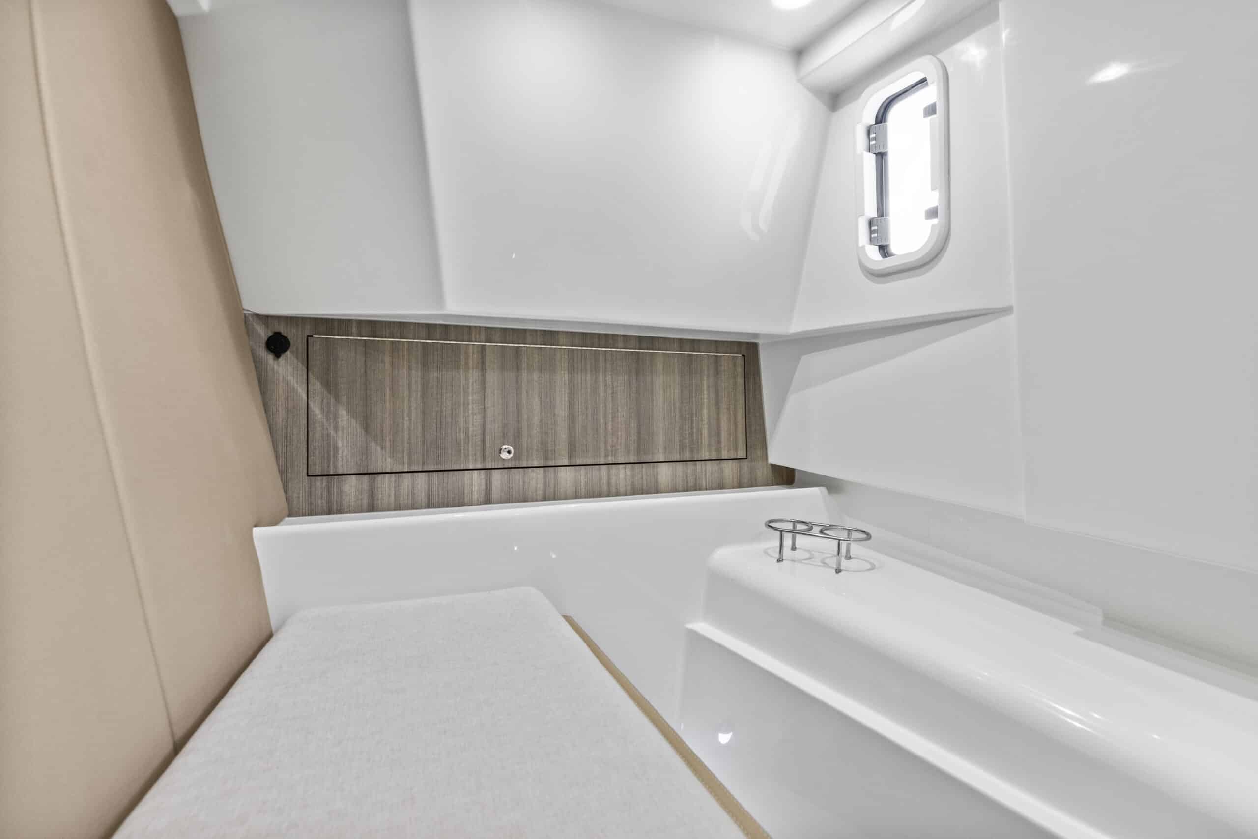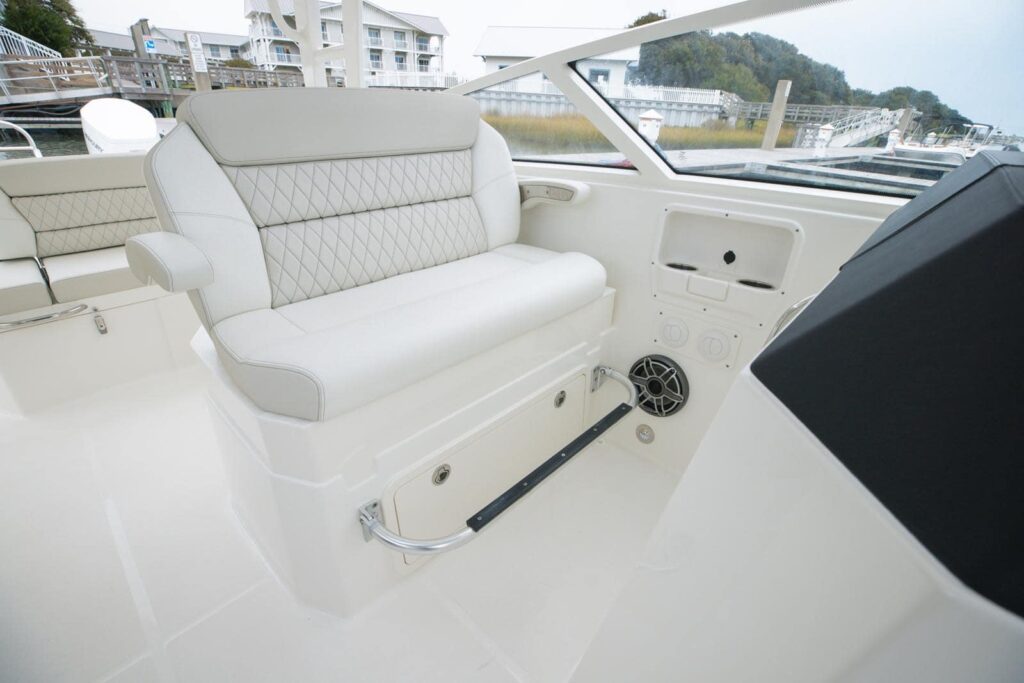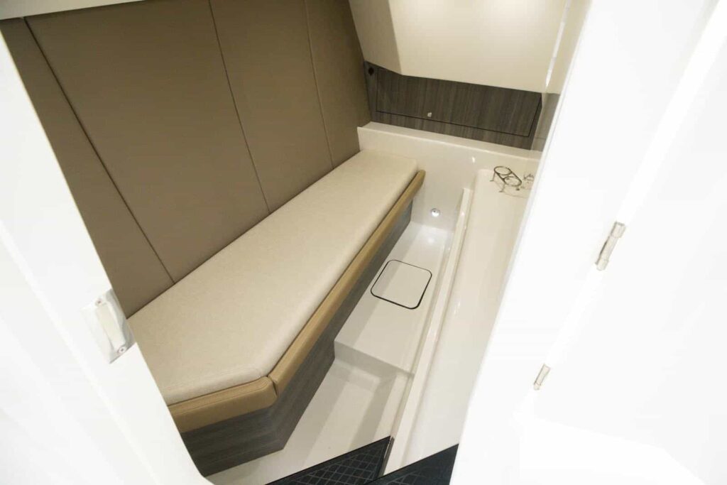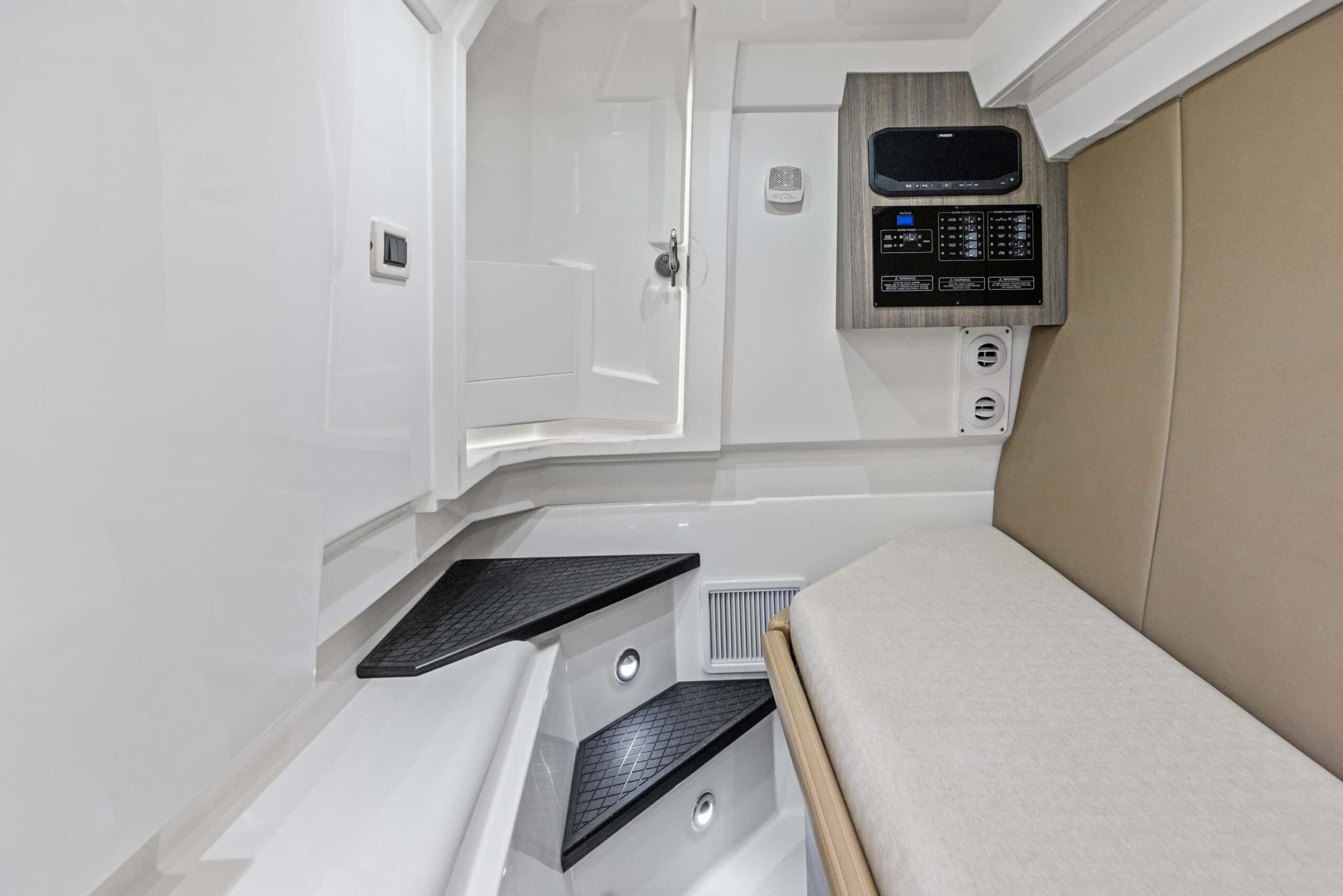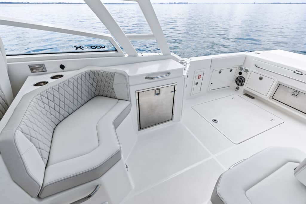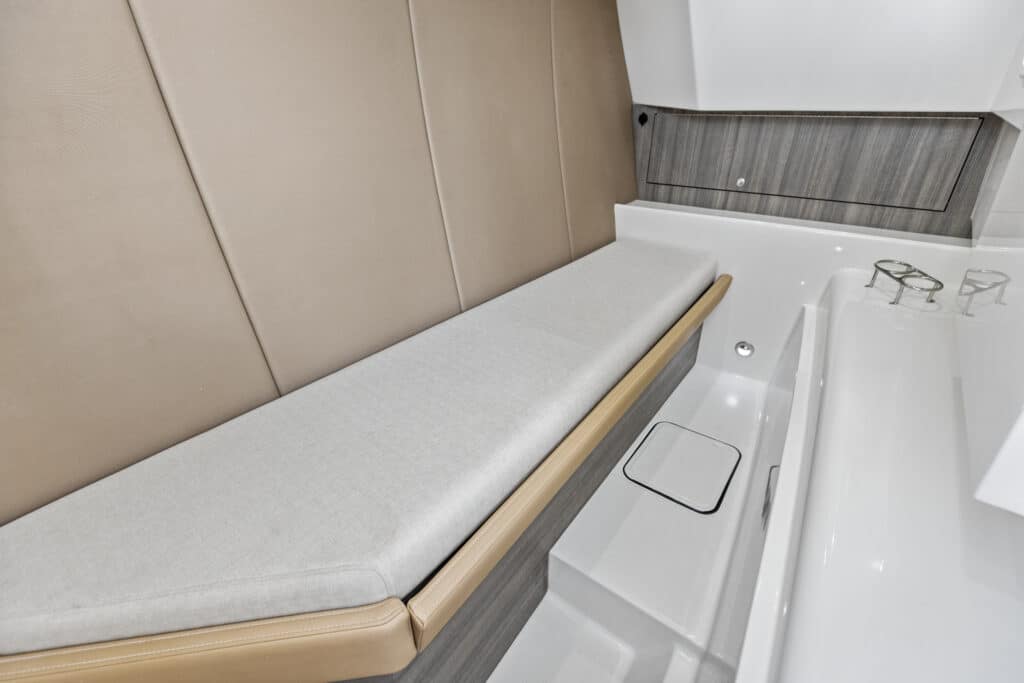 - Entertainment Center: Refrigerator Drawer, Aft Facing Seat w/ Storage Under, Storage Drawer, Helm Air Conditioning Vents & Tilt-Out Trash Can