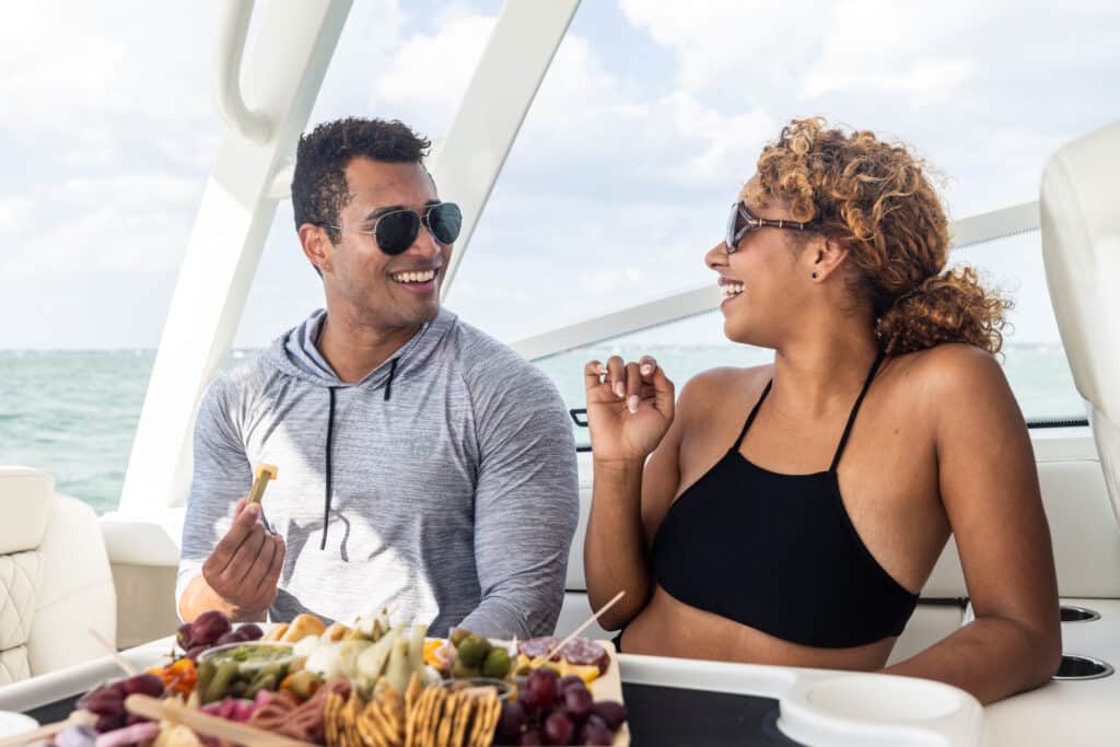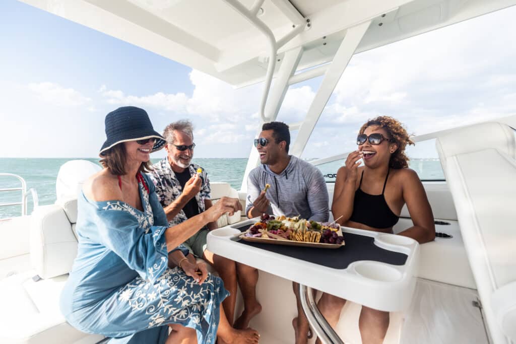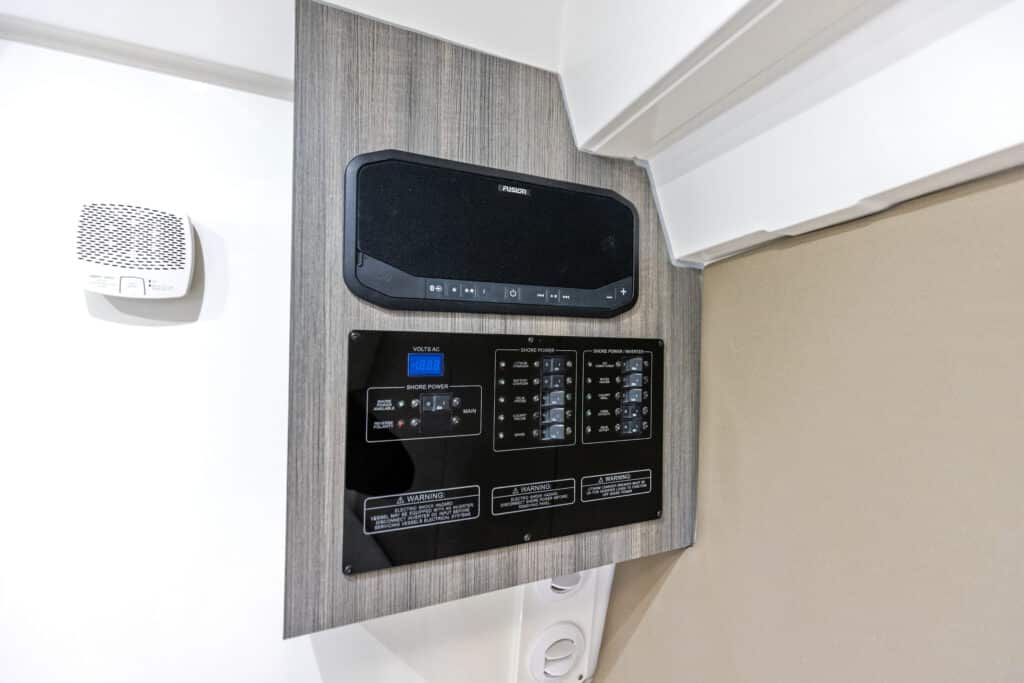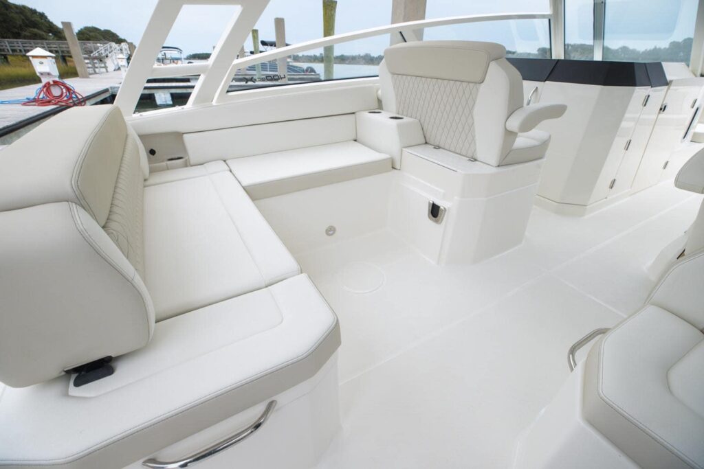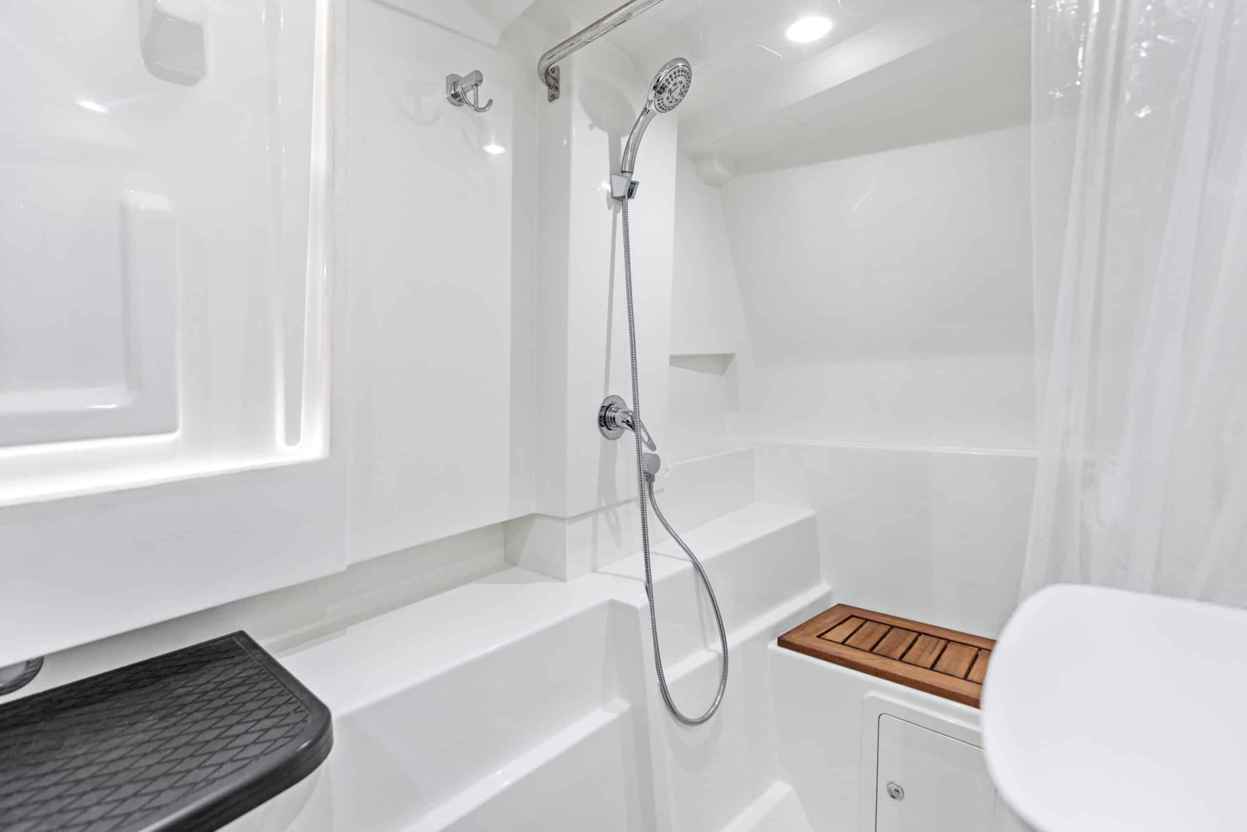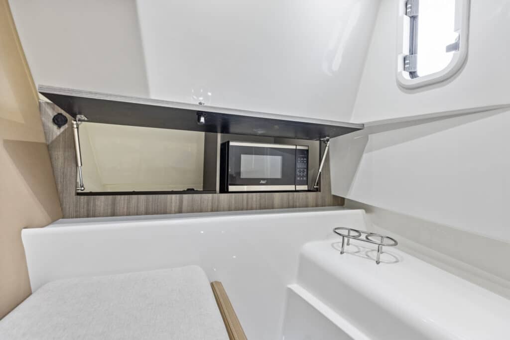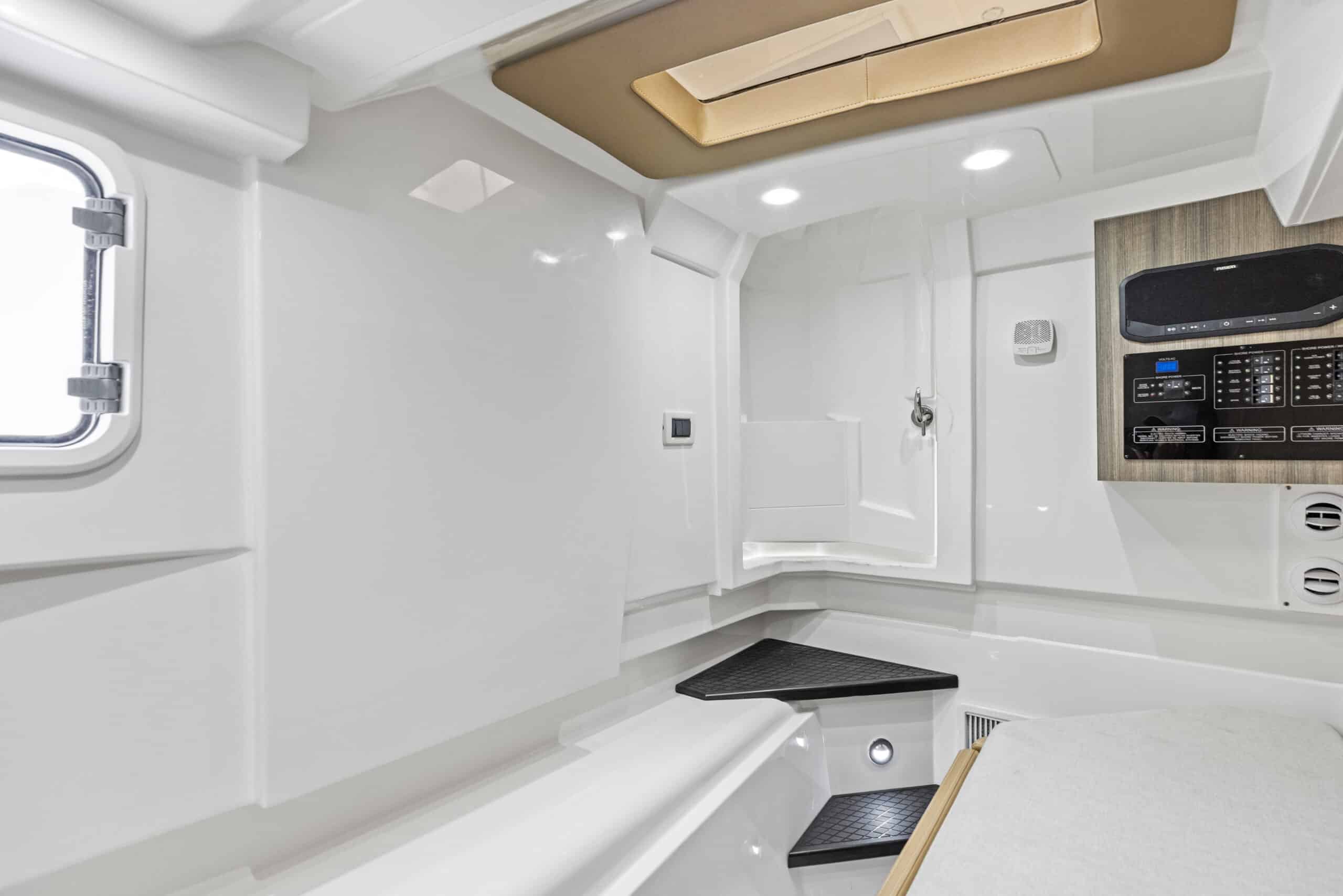 - Entertainment Center: Refrigerator Drawer, Aft Facing Seat w/ Storage Under, Storage Drawer, Helm Air Conditioning Vents & Tilt-Out Trash Can